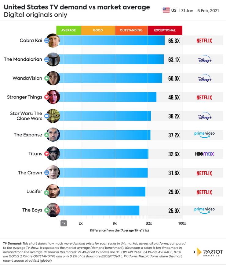 Как сообщает издание CBR со ссылкой на отчет аналитической компании Parrot Analytics, за период с 30 января по 6 февраля сериал «Кобра Кай» обошел по популярности среднестатистические показатели в 65,3 раза. На втором и третьем местах расположились «Мандалорец» и «Ванда/Вижн» от Disney+. Несмотря на то что космический вестерн обошел проект киновселенной Marvel, «Ванде/Вижну» удалось подняться на одну строчку по сравнению с предыдущей неделей и превысить средние показатели в 60 раз, что расценивается Parrot Analytics как «экстраординарный результат». Показатели «Мандалорца» превышают среднестатистические в 63,1 раза.